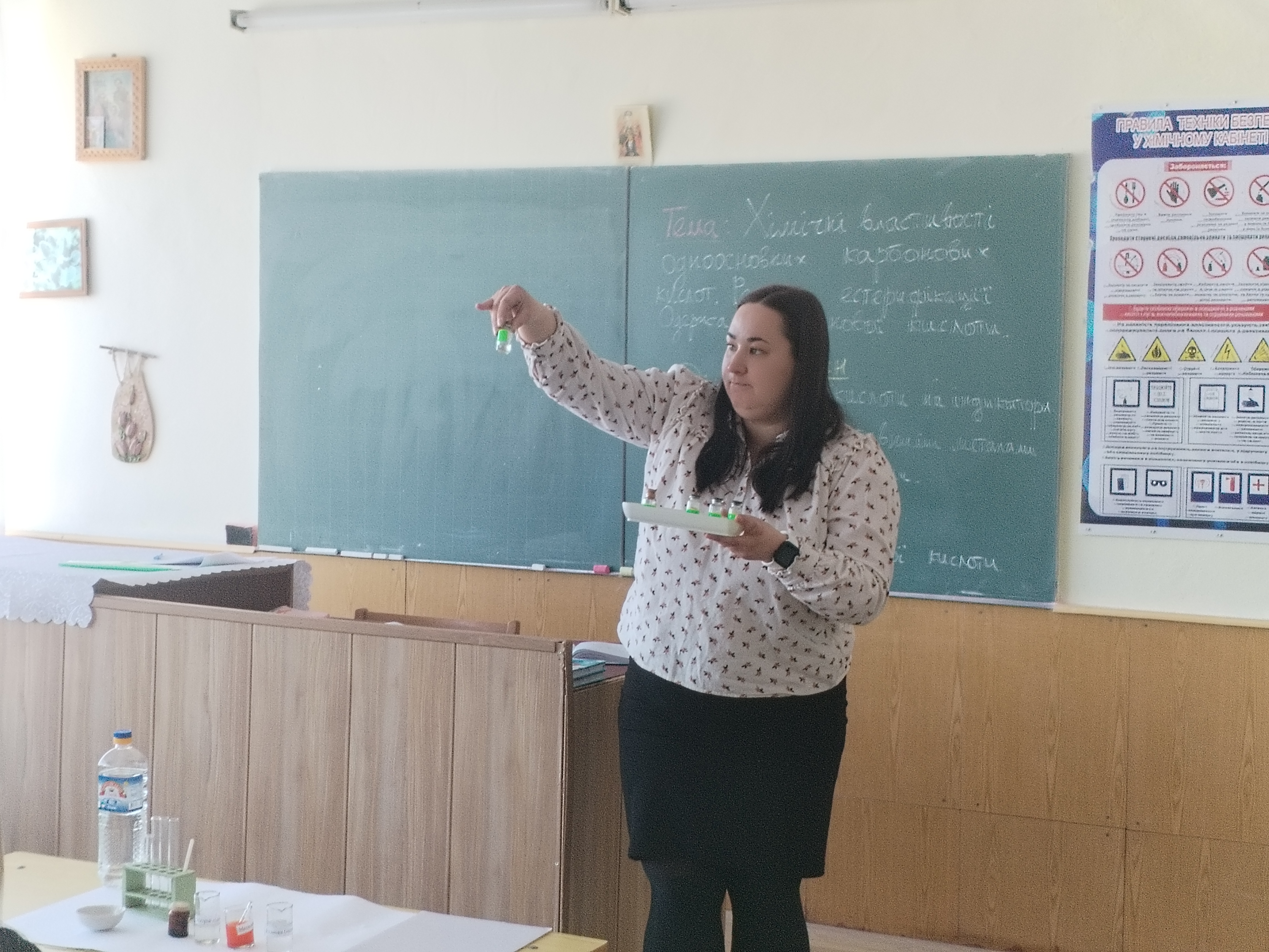 Особливу увагу було приділено проведенню хімічних дослідів з оцтовою кислотою, у ході яких учні спостерігали її взаємодію з різними речовинами та аналізували результати реакцій.
